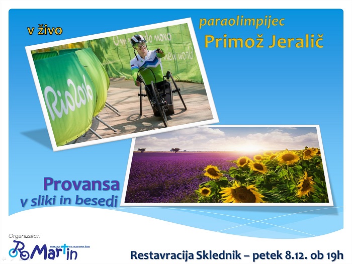 Kolesarska skupina RoMartin vas vabi, da uradni zaključek letošnjih kolesarskih romanj preživite v naši družbi. Dogajanje se bo odvijalo v restavraciji Sklednik v Žireh, in sicer v petek 8.12.2017 ob 19h. V goste bomo povabili paraolimpijca Primoža Jeraliča, sicer tudi osebnost leta v 2016. Več o njem si lahko prebereta na njegovi spletni strani.