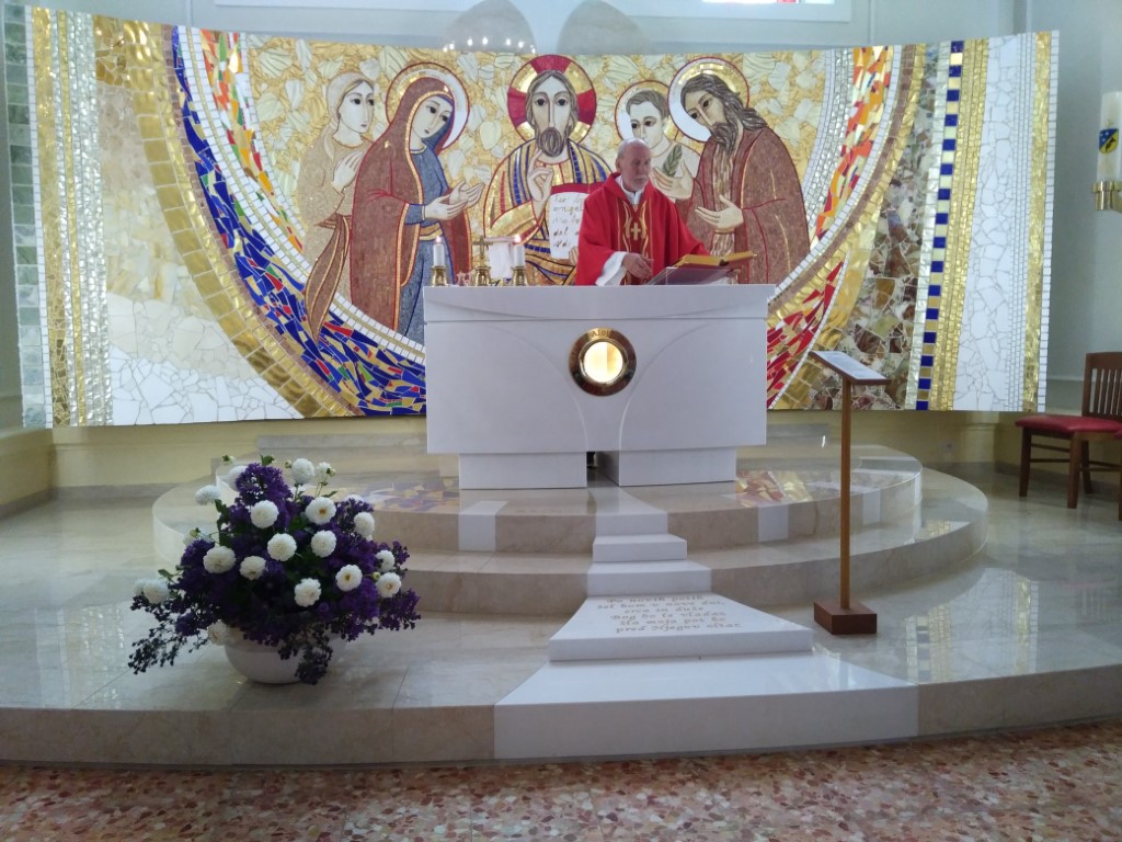 Na Zaplazu, v romarski cerkvi Marijinega vnebovzetja, je naš župnik g. Jožef Dolenc daroval sveto mašo. Pri tem smo se spomnili prve obletnice svetega misijona v Leskovici kakor tudi prikazovanja Marije v Fatimi pred 100 leti (prikazovanja od 13. maja do 13. oktobra 1917). Sveta daritev je potekala pri stranskem oltarju, katerega poslikava je delo p. Marka Ivana Rupnika.